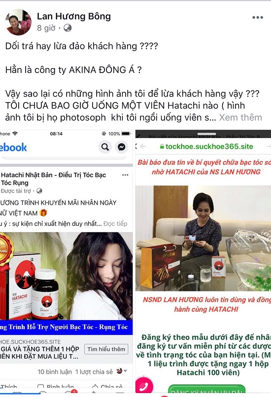 Để làm rõ vấn đề này, PV báo Đời sống& Pháp luật đã liên hệ với NSND Lan Hương và được biết, nữ nghệ sĩ không hề sử dụng sản phẩm chống rụng tóc, bạc tóc Hitachi. Những hình ảnh có mặt diễn viên Lan Hương đều đã bị phía bên kinh doanh photoshop, chỉnh sửa.
