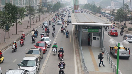Giao thông tại nhà chờ Khuất Duy Tiến khá thông thoáng tuy nhiên người dân vẫn lấn làn xe buýt nhanh BRT. Ảnh: Dân việt |