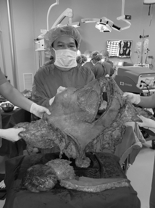 Kíp phẫu thuật huy động hơn 10 phẫu thuật viên và 20 nhân viên, bác sĩ khu mổ và gây mê hồi sức. Sau hơn 8 tiếng phẫu thuật, các bác sĩ đã cắt gần hêt khối u vùng lưng và mông khoảng 23 kg. Để đảm bảo cho sức khoẻ bệnh nhân, phần u lớn đùi và gối trái được để chờ phẫu thuật tiếp theo. Bệnh nhân được truyền hơn 5 lít máu.