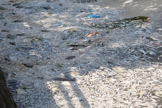 Số cá chết chủ yếu là cá dầu mè, rô phi và 1 số cá chép loại nhỏ khoảng 3-4 lạng/1 con. Trong đó có những con mới chết và những con chết từ hôm qua đang trong quá trình phân huỷ, bốc mùi hôi thối. Ước tính số lượng cá chết lên tới hàng chục tấn.