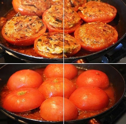 Sau đó cho cà chua nhồi thịt vào đun tiếp cho tới khi chín. Sau khi chua nhồi thịt chín bạn xếp lên đĩa, từ từ rưới nước sốt lên.