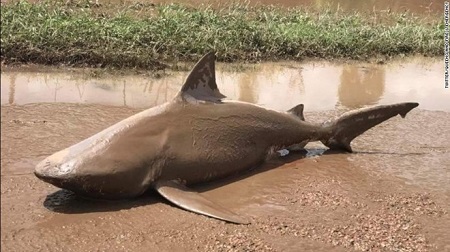 Những hình ảnh con cá mập với đầy bùn đất nằm trên đường đã được chia sẻ với tốc độ nhanh chóng.