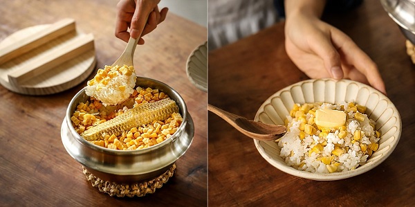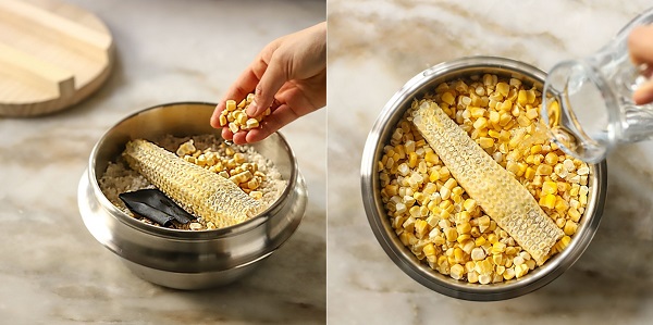 - Bước 2: Trộn đều gạo với chút muối rồi cho vào nồi, đặt lõi ngô lên trên, thêm mảnh tảo bẹ vào. Cuối cùng thêm ngô ngọt lên trên. Đổ nước lọc vào rồi nấu chín thành cơm (bạn có thể nấu bằng nồi cơm điện).