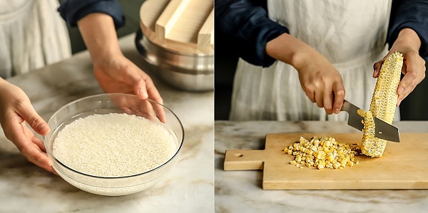 - Bước 1: Gạo vo sạch, ngâm trong nước khoảng 30 phút. Ngô ngọt rửa sạch rồi thái lấy phần hạt.