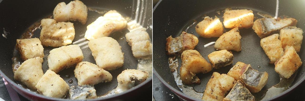 Bước 1: Cá rửa sạch thái khối vuông, cho cá vào bát rồi thêm chút muối, rượu nấu ăn, hành lá thái khúc và gừng thái sợi vào trộn đều, ướp cá khoảng 15 phút. Cá sau khi ướp lăn qua tinh bột cho bột phủ đều miếng cá.