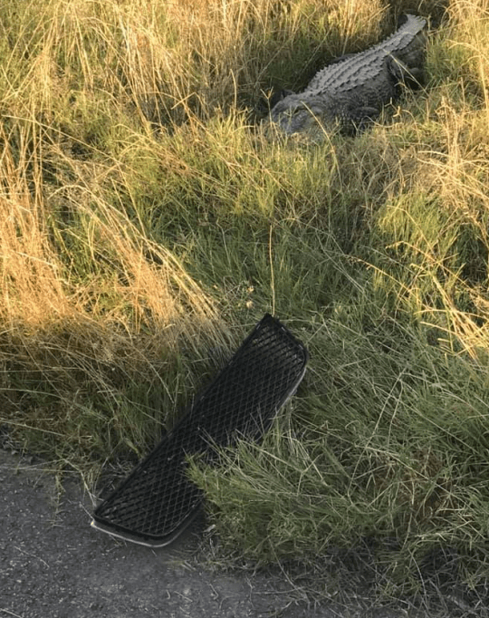 Cá sấu dài 2,5m đã cắn tung cái chắn bùn phần đầu xe của cảnh sát trưởng khi bị họ chặn đường. Ảnh: Đồn cảnh sát Giáo xứ Caddo |