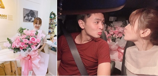 Sáng 8/3, ca sĩ Bảo Thy khoe bó hoa hồng với dòng chữ: 'Happy Women's Day vợ yêu' do ông xã Phan Lĩnh tặng. |