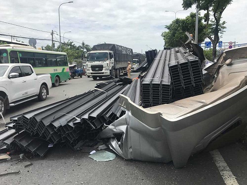 Tài xế phanh gấp làm hàng trăm thanh đà bằng thép trượt tới ủi bay cabin cùng tài xế khỏi xe container trên quốc lộ 1 ở Sài Gòn, tài xế xe nguy kịch.