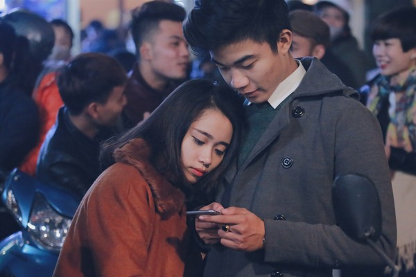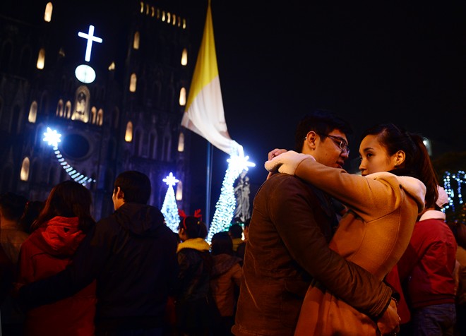 Cùng với đó rất đông các bạn trẻ đã trao gửi tình cảm đến một nửa của mình ngay trước cửa Nhà thờ lớn Hà Nội. Đó là những khoảnh khắc chụp ảnh kỷ niệm, những cái nắm tay hoặc lãng mạn hơn là những nụ hôn…Tất cả tạo nên một không khí Giáng sinh an lành và ấm áp.