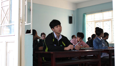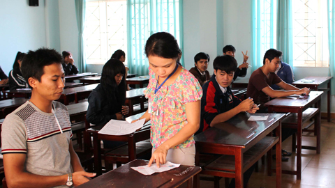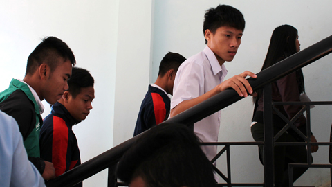 | Văn Toàn (áo khoác) chờ đánh số báo danh chờ phát đề thi môn văn. |