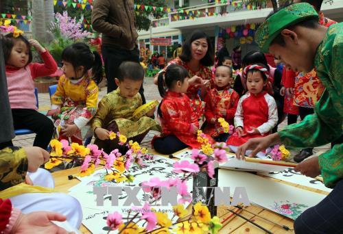 Trẻ em thích thú với ông Đồ cho chữ tại trường Mầm non Hoa Sen, TP Vinh. Ảnh: Bích Huệ/TTXVN |