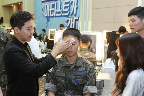 Nghệ sĩ trang điểm hướng dẫn cách sử dụng mỹ phẩm cho quân đội Hàn Quốc. Ảnh: Amorepacific |