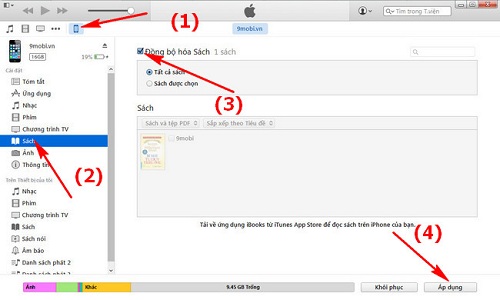 Tiếp tục tiến hành đồng bộ hóa bằng cách: bạn chọn vào hình iPhone > Sách > tích v vào Đồng bộ hóa sách > Bấm Áp dụng.