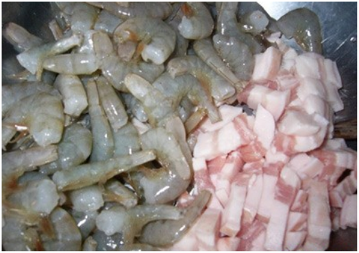 Nguyên liệu cho nhân bánh: 100g thịt ba chỉ, 100g tôm, 20g mộc nhĩ, ½ thìa café hạt tiêu, 1 thìa đường.