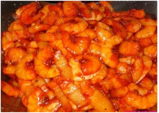 Cho tôm vào rang săn lại, thêm chút đường để vỏ tôm được giòn và có màu đẹp, cho thịt – nấm mèo vào đảo cùng tôm.