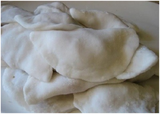 Chia bột thành những phần nhỏ, vo tròn, ấn dẹt rồi xếp nhân tôm thịt vào gấp mép đôi 2 mép tạo hình bán nguyệt.