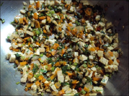 Nấm đông cô, nấm mèo ngâm nước nóng cho nở mềm, rửa sạch lị rồi thái nhỏ. Cà rốt, củ sắn gọt vỏ, rửa sạch, cắt hạt lựu. Đậu hũ thái sợi, cắt nhỏ vừa ăn. Bắt chảo lên bếp, cho dầu ăn vào đun nóng, cho hành tím vào phi thơm, tiếp theo trút nấm, cà rốt, củ sắn xào qua tầm 2 phút rồi nêm nếm 1 muỗng bột nêm chay, nửa muỗng muối, 1 ít tiêu cho vừa miệng đảo đều cho thấm. Cuối cùng cho đậu hũ vào xào thêm khoảng 1 phút rồi tắt bếp đổ hành lá vào đảo đều.