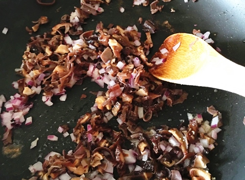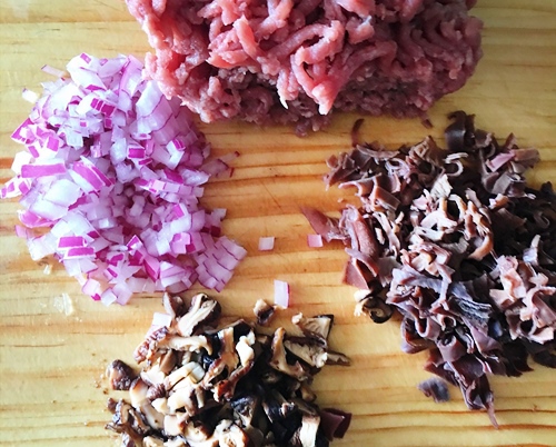 Nấm hương, mộc nhĩ bạn đem ngâm nước cho nở mềm rồi cắt bỏ phần gốc cứng rửa sạch, thái và băm nhỏ.
