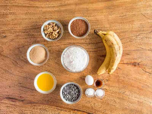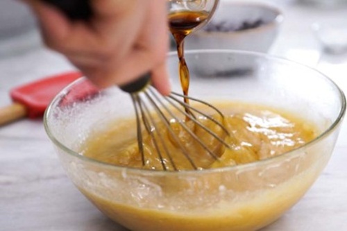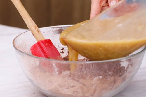 Chuối chín bóc vỏ, cho vào một bát lớn dầm nát rồi dùng phớt đánh nhuyễn. Sau đó trộn chuối với bơ nóng chảy, đường nâu, trứng và vani. Khuấy đều hỗn hợp cho đến khi đường tan hết.