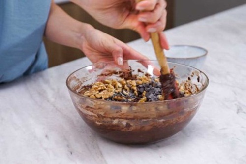 Cho sô cô la đen chip và nhân quả óc chó cắt nhỏ vào trộn cùng.