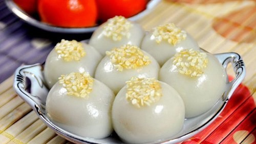 - Bước 5: Bánh nguội, vớt bánh ra đĩa, chắt phần nước đọng lại ở đĩa đi. Đối với bánh trôi bạn dùng đầu ngón tay chấm vào bát vừng rang rồi chấm lên bề mặt bánh.