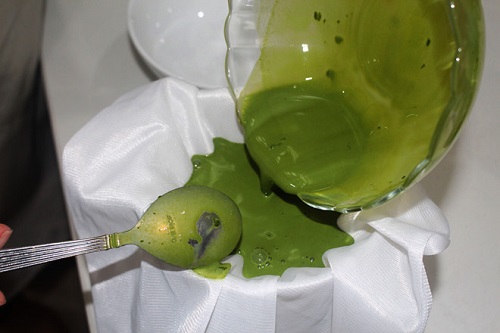 Thao tác dùng nĩa đâm vào lớp rau câu vừa đông giúp các lớp dính vào nhau.