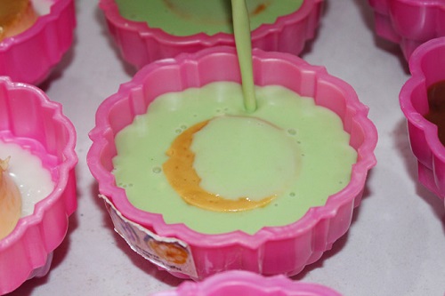 - Bước 6: Pha hỗn hợp rau câu matcha theo công thức ở bước 3. Đổ hỗn hợp rau câu matcha vừa pha vào đầy khuôn bánh (phần rau câu sẽ bao phủ cả bánh flan). Đổ lần lượt đến hết khuôn.