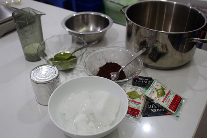 Khi hỗn hợp rau câu sôi, múc khoảng 500 ml cho vào phần bột matcha, quấy đều. Đổ một lớp rau câu matcha mỏng vào đáy khuôn. Đổ lần lượt đến hết khuôn.