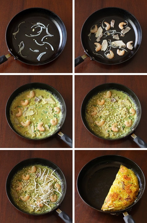 – Sau đó bạn cho nhân tôm, thịt, nấm, giá vào và gập bánh lại. Rán bánh đến khi vàng đều hai mặt thì dừng lại.