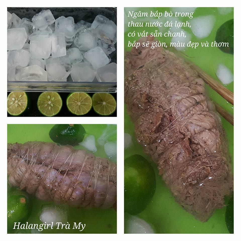 - Khi bắp bò vừa chín tới (nhớ là không được luộc kỹ, bắp nhừ quá ăn không ngon), vớt bắp ra rồi thả ngay vào thau nước đá lạnh, đã vắt sẵn 2 quả chanh, vắt xong cho luôn vỏ chanh vào thau nước, làm thế để bắp bò giòn ngon, mùi thơm, màu đẹp - đây là mẹo không phải bạn nào cũng biết.