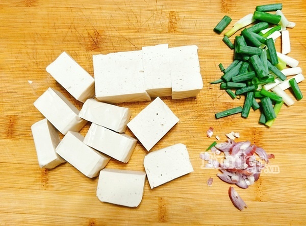 Bước 1: Đậu trắng rửa sơ qua rồi cắt miếng vuông vừa ăn. Hành lá rửa sạch, thái khúc ngắn. Hành khô băm nhỏ.