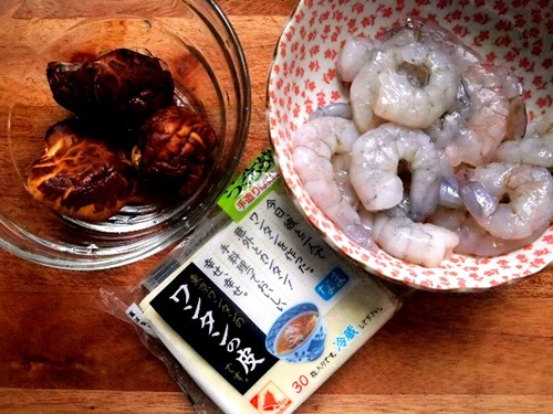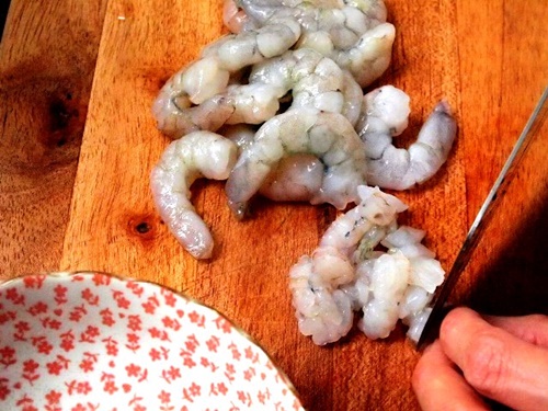 Cắt tôm thành từng miếng nhỏ, nấm thái nhỏ trộn đều cùng nhau. Ướp rượu, muối, hạt tiêu rồi để 1 lát cho ngấm.