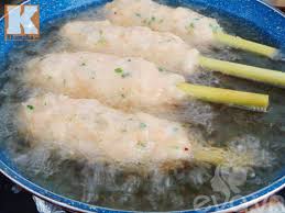 Bước 3: Bắc chảo dầu lên bếp (không cần dầu nhiều), cho từng cây chả tôm cá bọc sả vào chiên với lửa hơi cao. Khi chả tôm có màu vàng như ý thì gắp ra đĩa.