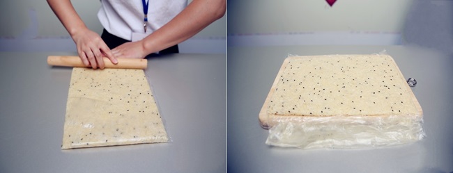 - Dùng thanh cán để cán cơm thành tấm với độ dày khoảng 1cm. Sau khi cán xong, dùng kéo cắt bỏ lớp túi bên trên cơm.