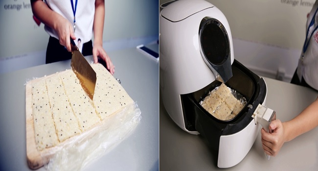 - Dùng dao cắt cơm thành từng miếng vuông nhỏ. Lót một lớp giấy bạc vào khay nướng của nồi chiên không dầu. Quét một lớp mỏng dầu ăn lên giấy bạc rồi xếp cơm đã cắt vào. Chiên cơm ở 200 độ C trong 15 phút là được.