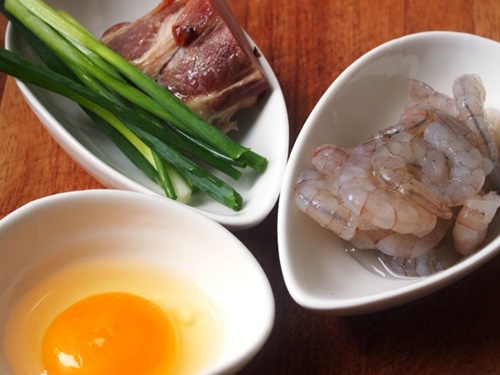 Thêm thịt lợn nướng và tôm đã xào tái vào.