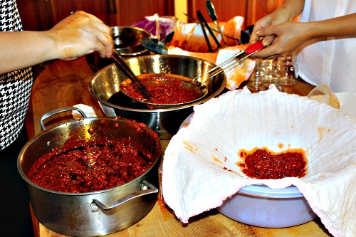 Khi đã lấy hết phần thịt gấc và hạt, bạn đem ra ngoài trời phơi khoảng 2-3 tiếng cho thịt gấc khô se lại. Nếu không có nắng, hoặc thời tiết không đẹp bạn có thể để thịt gấc vào tủ lạnh khoảng 4 tiếng như vậy sẽ làm phần thịt gấc cứng lại và bóc lớp màng đỏ ra khỏi hạt gấc 1 cách dễ dàng.