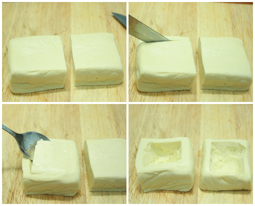 Bước 1: Đậu phụ cắt đôi theo chiều ngang. Dùng dao rạch hình vuông ở giữa mỗi miếng đậu nhỏ, dùng thìa múc phần đậu bên trong hình vuông ra nhưng không làm thủng đáy miếng.