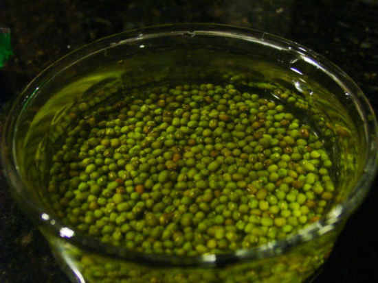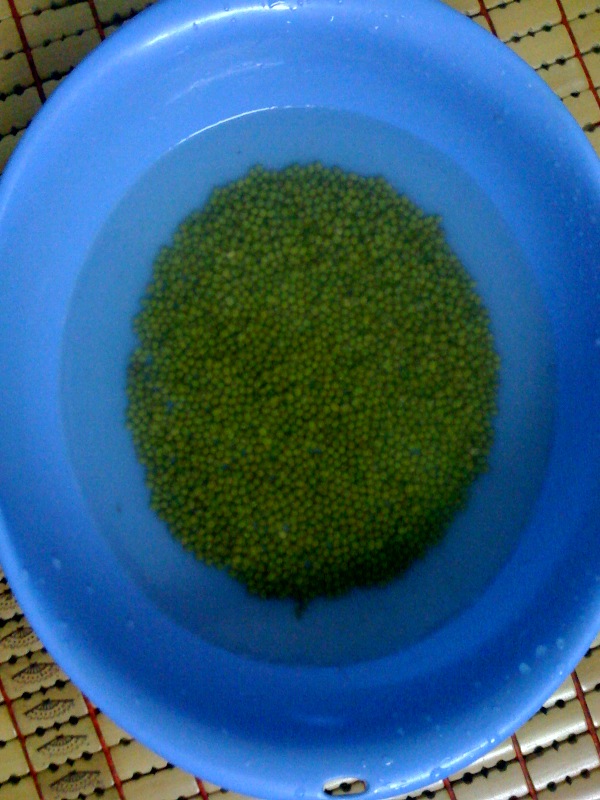 - Bước 1: Ngâm đỗ xanh vào ngập 1 lít nước ấm 40 độ, để qua đêm (11-12 tiếng), 6 tiếng lại thay nước 1 lần.