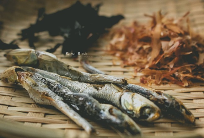 - Cá khô, rong biển cùng cá bào cho vào túi lọc, cho nước vào nấu khoảng nửa tiếng để lấy nước dùng (cần 600ml nước dùng).