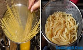 Bắc nồi nước lên bếp, cho vào chút muối và 1 muỗng canh dầu ăn, đun sôi nước, thả mì vào luộc vừa lửa, luộc theo thời gian ghi trên bao bì nhé, khoảng 8-10 phút, đến khi bẻ đôi sợi mì thấy còn lõi nhỏ như sợi tóc là mì vừa chín tới. Đổ mì ra rá để ráo nước.