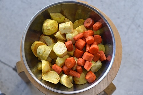 Cà rốt và khoai tây thái miếng vừa ăn, Sả đập dập cắt khúc dài. Tỏi băm nhuyễn, quế lấy lá.