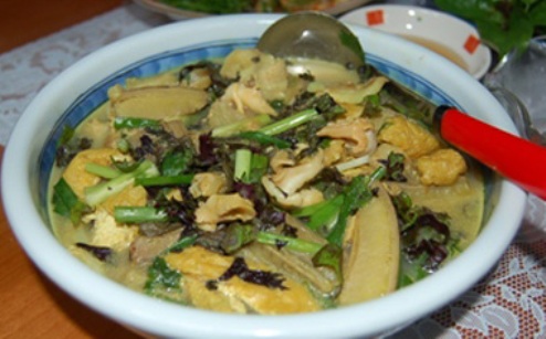 Cuối cùng cho hành lá và lá tía tô + lá lốt thái nhỏ, múc ra bát và thưởng thức.