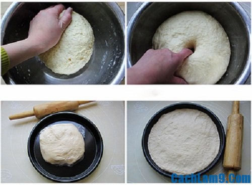 Cách làm đế bánh pizza như sau: Cho bột mì + men nở + muối + nước và dầu ăn trộn đều nhau. Sau đó dùng thìa cán dẹt mỏng miếng bánh, chú ý để phần rìa bánh dày hơn để nguyên liệu không bị rơi ra ngoài. Lấy một chiếc dĩa đâm vào giữa chiếc bánh để bánh không bị phồng khi nướng.