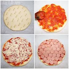 Phết đều phô mai đã thái sợi và sốt cà chua lên lòng đế bánh, cho nhân bánh đã chế biến như thịt bò bằn và ngô, hoạc cho xúc xích thái miếng và giăm bông, dứa hay hành tây... tuỳ từng khẩu vị của các bạn sau đó rắc thêm một chút phô mai bào sợi lên trên mặt bánh.