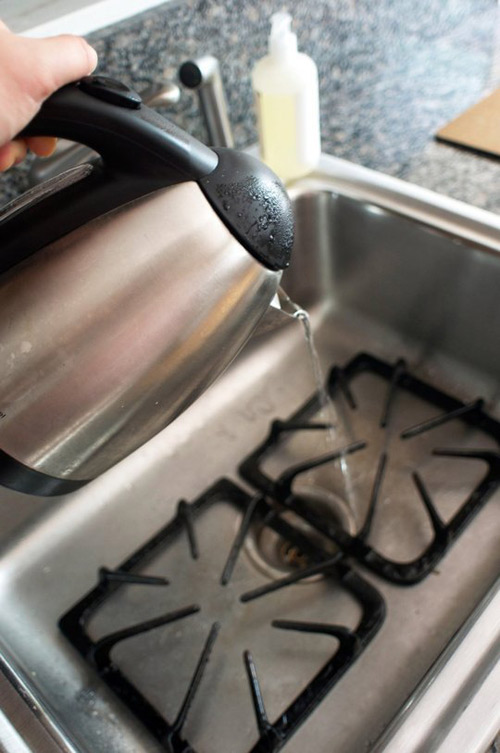 Tiếp theo, từ từ dội nước sôi lên kiềng bếp đã để sẵn trong bồn rửa bát. Bước này sẽ giúp hòa tan và loại bỏ bớt dầu mỡ.