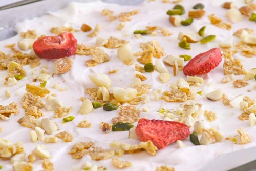 Rắc cornflakes, hạt khô và dâu tây khô tán đều lên trên sữa chua.