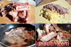 Bước 1: Sườn sụn mua về rửa sạch, chặt miếng vừa ăn. Cho sườn chần qua nước sôi để sườn ra hết mùi hôi và chất bẩn. Sau đó các bạn rửa lại sườn một lần nữa, để ráo nước.