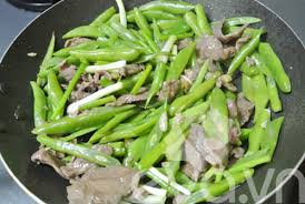Tiếp tục đặt chảo lên bếp, làm nóng dầu rồi đổ đậu cô ve vào xào chín. Bạn để lửa to, đảo đều tay đến khi đỗ chín tới thì rút hết thịt bò xào sơ vào.