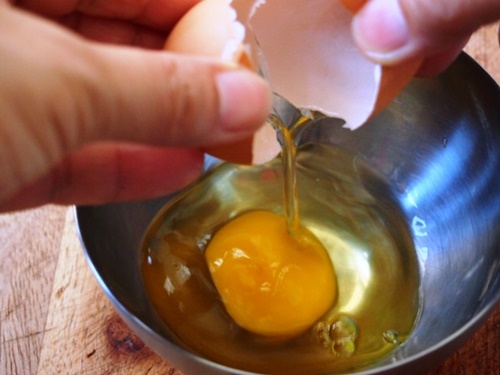 Trứng đập vào bát, đánh tan lòng trắng cùng lòng đỏ rồi thêm nước (hoặc nước dùng gà) và hành lá xắt nhỏ trộn đều.